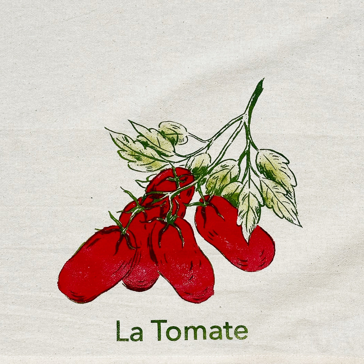 The Tomato two color print is available in french (La tomate), Spanish (El Tomate) or Italian (Il Pomodoro). this print is a 3 step process, hand printed with hand painted accetns